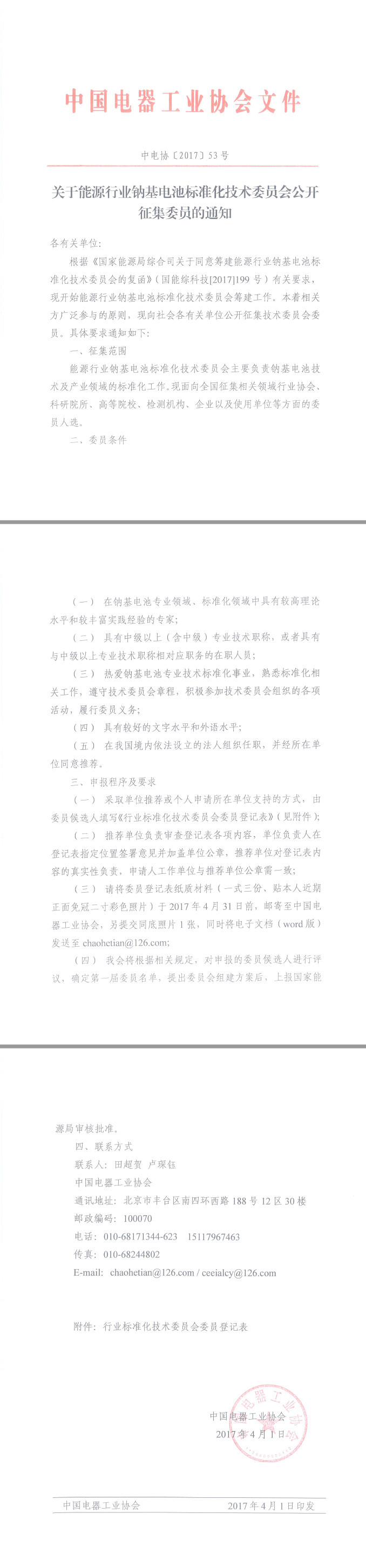 关于能源行业钠基电池标准化技术委员会公开征集委员的通知