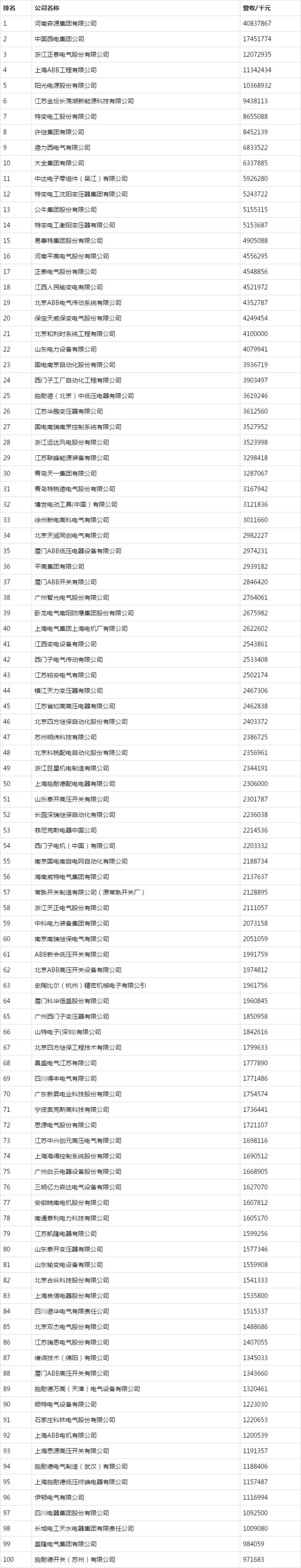 由机工传媒·电气时代杂志社主办,中国机械工业联合会作为指导单位发布了第19届中国电气工业100强研究报告,本届中国电气工业百强企业入围标准为9.26亿元,比上一届的8.83亿元提高4.88%。7家企业的营业收入超过100亿元,分别是河南森源、大全集团、白云电器、许继集团、中国西电、卧龙集团和国电南瑞七家企业。下面来看中国电气工业100排行榜具体榜单。